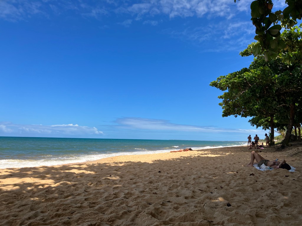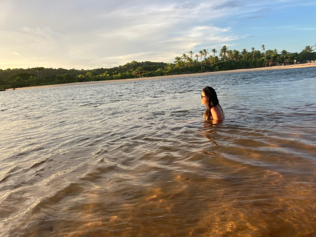 Deixei minhas malas no quarto, e em menos de 5 minutos já estava na praia. Mais longe do rio, a praia é mais bonita, a água é quentinha, e dá para entrar no mar sem se afogar. Com muita sombra de árvore, estendi minha canga, e fiquei horas ali, curtindo a brisa marinha, o barulho das ondas, e refletindo muito sobre minha vida.